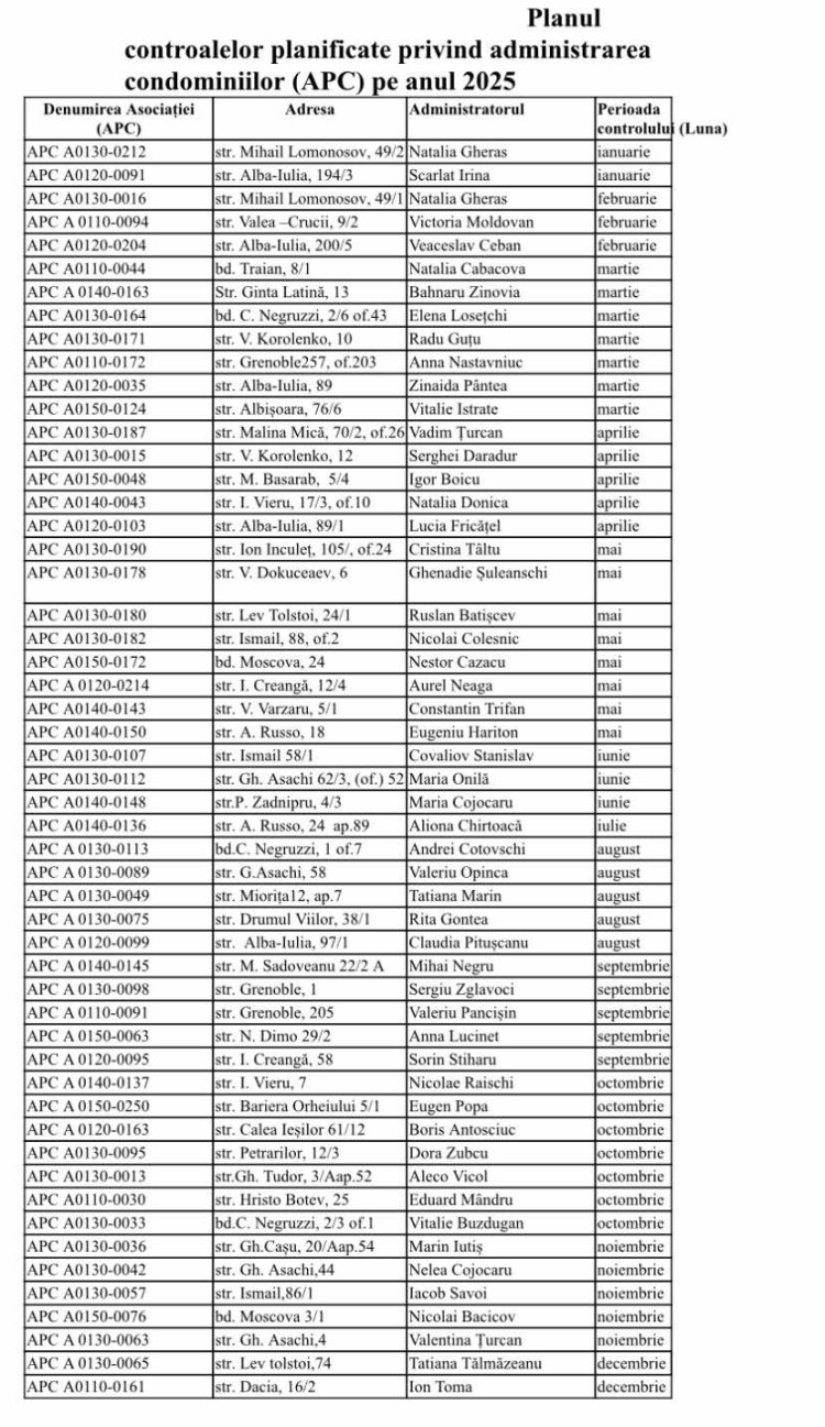 Întru executarea prevederilor din HG nr.568/23 pentru aprobarea Regulamentului privind controlul administrării condominiului, Secția controlul formării asociațiilor de proprietari și a activității administratorilor blocurilor de locuințe din cadrul DGLCA a elaborat planul controalelor planificate privind administrarea APC pentru anul 2025. Vedeți detalii în documentul atașat.